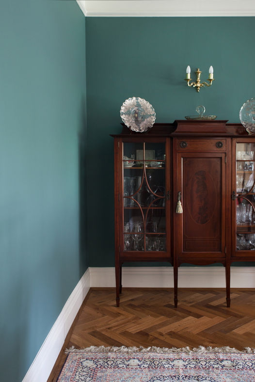 This colour consultation was for a formal dining room and lounge space in a beautiful Edwardian home. The owners hadn't updated the decor for over 20 years. They also had some furniture they wanted to keep in both rooms, as well as original architectural features such as the stained glass windows so we used these to to chose paint colours and window dressing fabrics that would compliment them. Both rooms were south facing meaning we could go for richer deep blue/green colours.